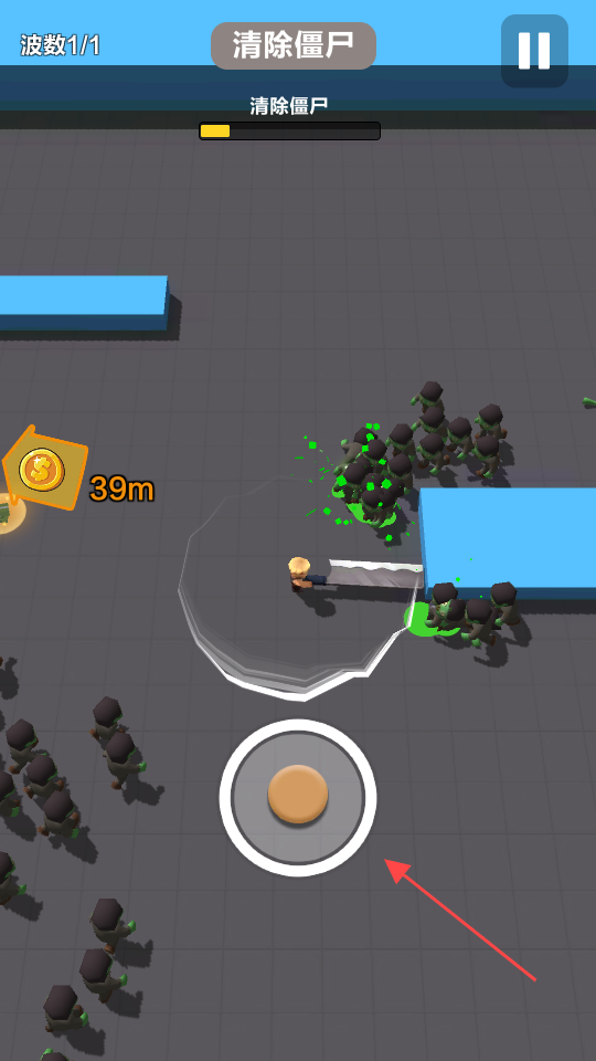 2、操控角色,利用屏幕下方圆盘控制移动,清除关卡中的僵尸。