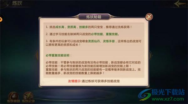 1、炼妖前的两只宠物越强炼妖后的宠物便越强力,且炼妖可以突破一般宠物的5技能上限,需要注意的是神兽和变异宠物不能参与炼妖。