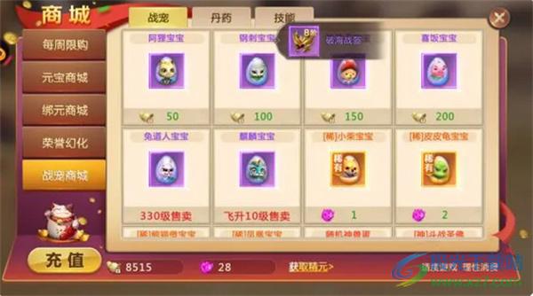 3、可以通过商城→战宠商城→技能,来进行技能的购买,如果将宠物洗练成极品之后还未达到五技能的话,那就需要再次洗练直至五技能为止。
