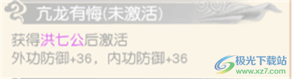 1、亢龙有悔:获得洪七公后激活,外功防御+36,内功防御+36。