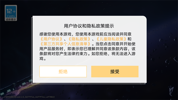 1、下载安装并进入游戏,查看用户协议与隐私政策后点击“接受”。