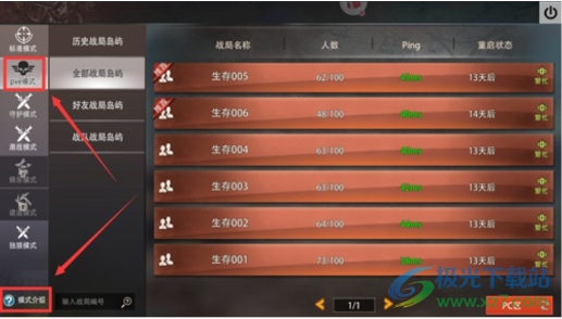 1、选游戏模式:游戏登录界面右下角,可以进入选择【游戏模式】的界面,首先选择PVE模式,熟悉游戏的操作和玩法规则,后面在转到PVP模式更好。