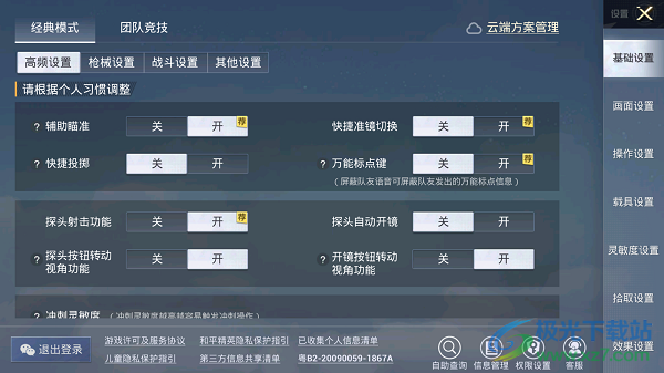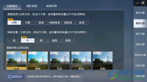 3、点击画面设置,可以看到画面品质、帧数设置、画面风格,可以根据手机配置调整。