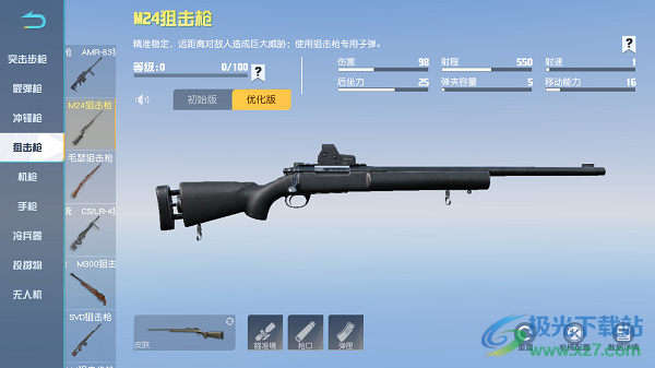 1、M24狙击枪:精准稳定,远距离对敌人造成巨大威胁,使用狙击枪专用子弹。