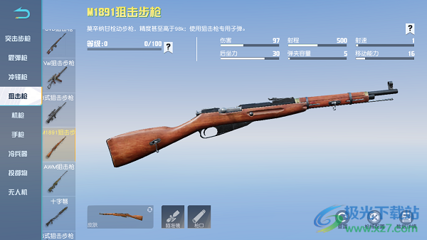 2、毛瑟狙击枪:经典老枪,远距离精确瞄准后有奇效,使用狙击枪专用子弹。