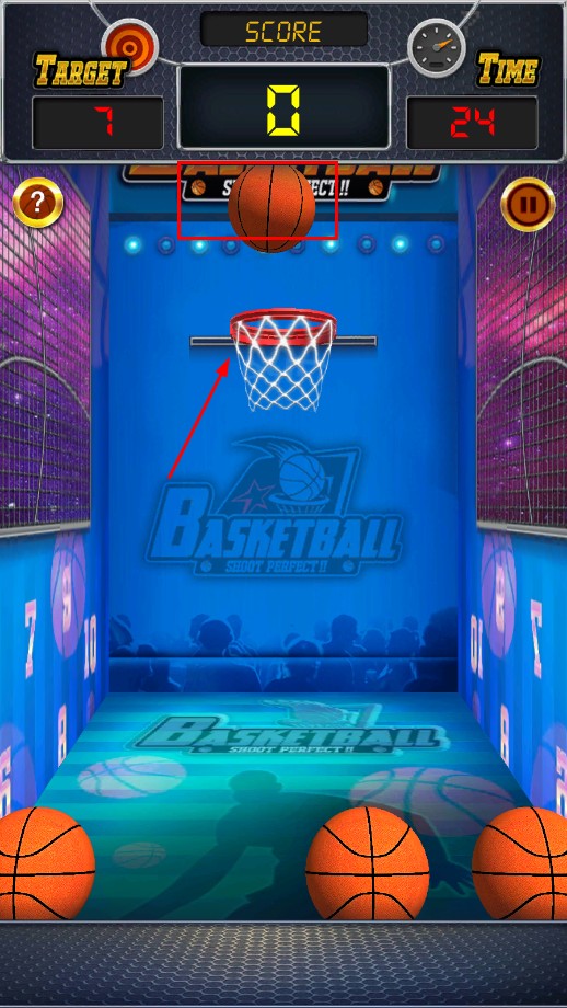 2、挑战中,瞄准篮筐,让篮球顺利投入篮中,积累分数。