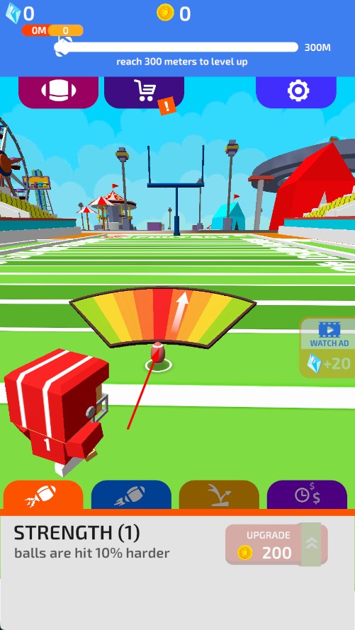 1、通过控制力度指针,发射橄榄球,争取达到更远距离。
