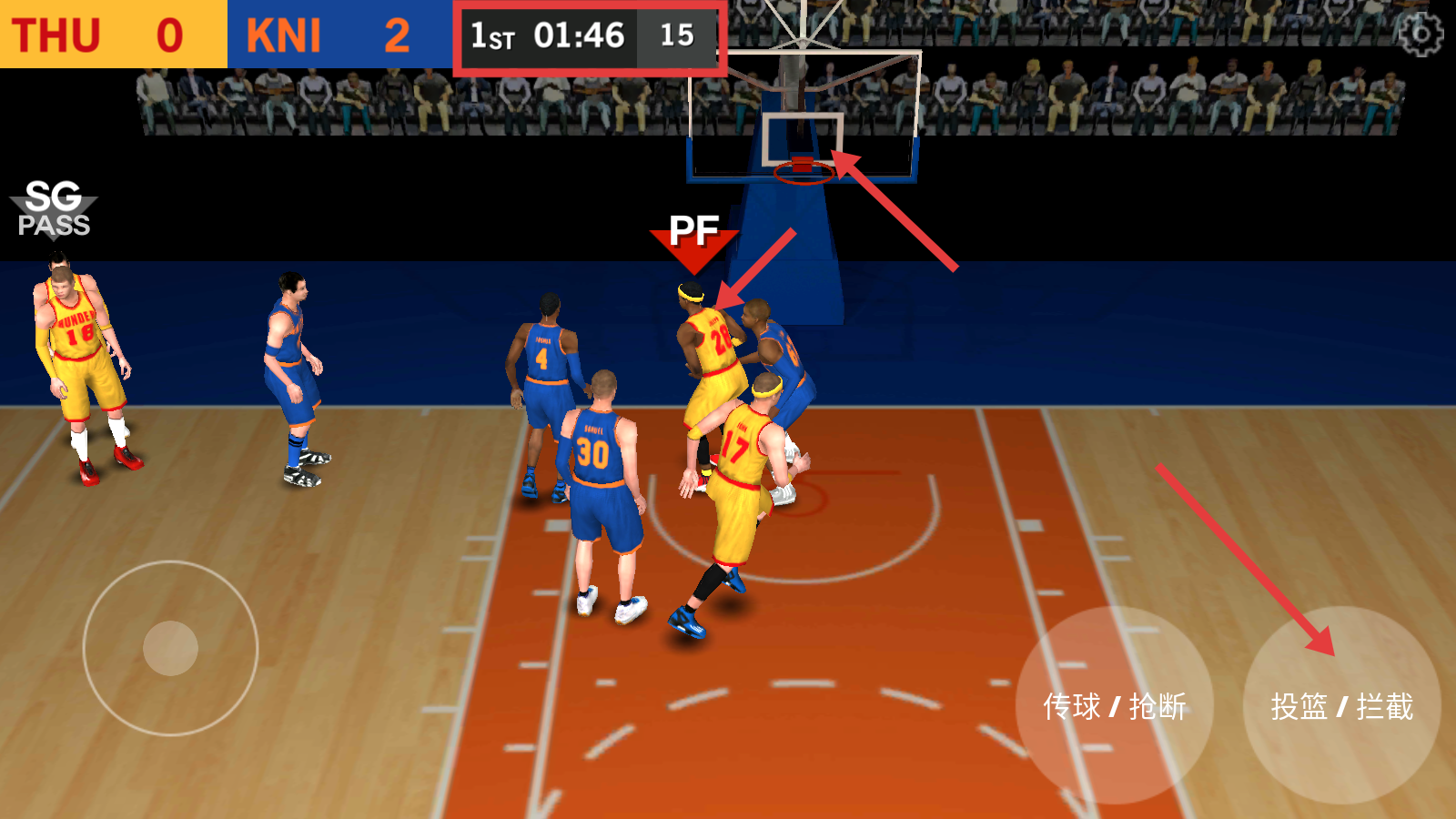 4、点击【投篮/拦截】按钮,尝试投篮得分,注意比赛时间。