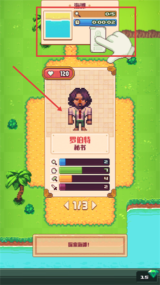 2、在角色界面,查看【罗伯特-秘书】的属性面板后,点击【探索海滩!】按钮,开启海滩场景的探索流程。