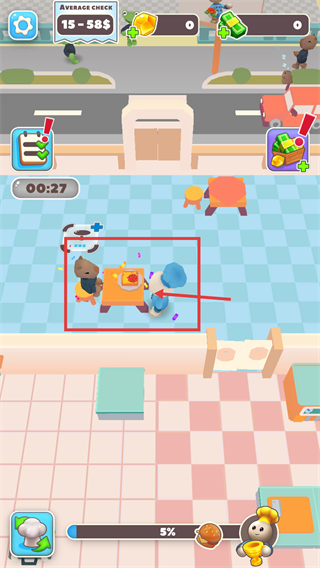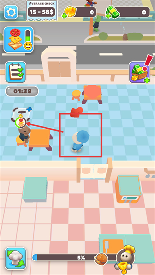 1、看到【Average-Check-15-58$】的餐厅界面,操控角色前往就坐的顾客处,接收订单需求,推进餐厅的服务流程。