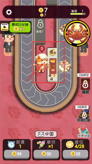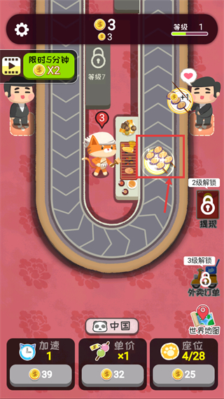 1、界面显示等级1、金币3,点击标注的【2级餐食】完成对应订单,获取金币,推进美食经营的订单处理流程。
