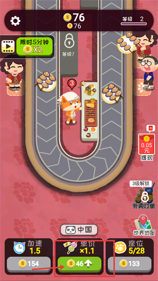 3、等级升至2后,点击标注的【单价】按钮提升餐食单价,增加单次订单收益,优化美食经营的收益获取效率。