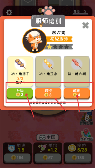 4、进入【厨师培训】界面,消耗3金币点击标注的升级按钮,提升林大狗厨师等级,解锁更多菜品拓展经营。