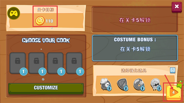 1、在关卡准备界面,明确【关卡目标-110】金币,点击标注的黄色按钮进入关卡,其余功能在【关卡5】解锁,推进餐厅服务任务。