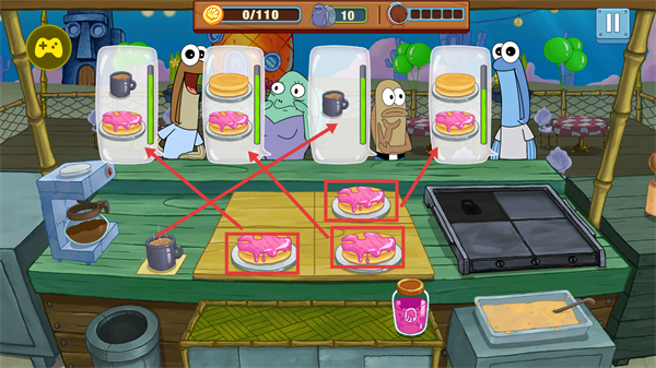 2、进入厨房后,目标【0/110】金币,将制作好的【蛋饼】【咖啡】对应递给顾客,完成订单积累进度以达成关卡目标。