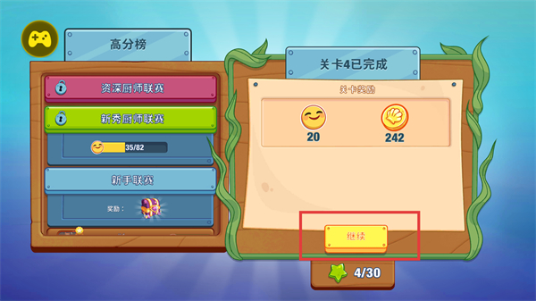 3、完成【关卡4】后,获得奖励,点击【继续】按钮,推进至后续的关卡或设施升级环节。