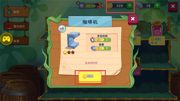 4、在升级界面,消耗【550】贝壳升级【咖啡机】,可缩短【烹饪时间4→3】并提升【容量1→2】,优化厨房的制作效率。