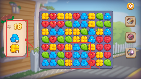 2、关卡中,优先消除被框选的蓝色、黄色花朵,达成左侧目标数量(蓝色18、黄色18),同时积累消除进度。