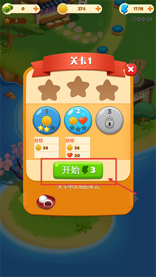 1、在关卡1界面中,点击被框选的【开始】按钮,消耗3个道具开启关卡,目标是完成【36】的金币与爱心任务。