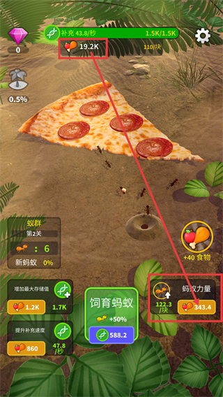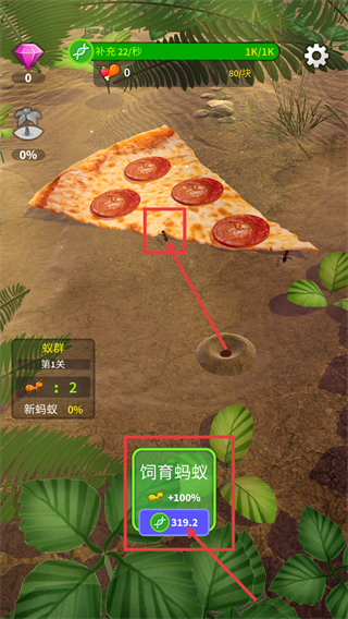 1、处于【蚁群-第1关】时,点击【饲育蚂蚁】按钮,消耗【319.2】对应资源,可提升蚂蚁数量+100%,助力获取披萨类食物资源。
