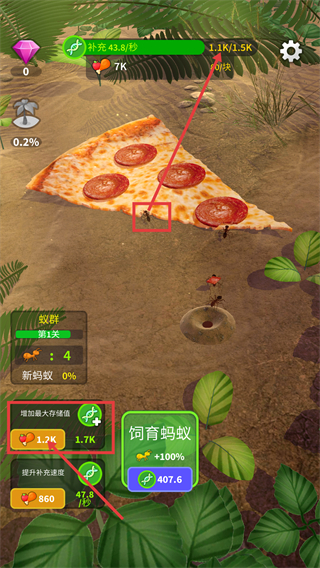 2、通过消耗【1.2K】资源提升【增加最大存储值】至【1.7K】,升级【补充速度】,助力蚁群数量增至4只,提升【补充-43.8/秒】推进关卡。