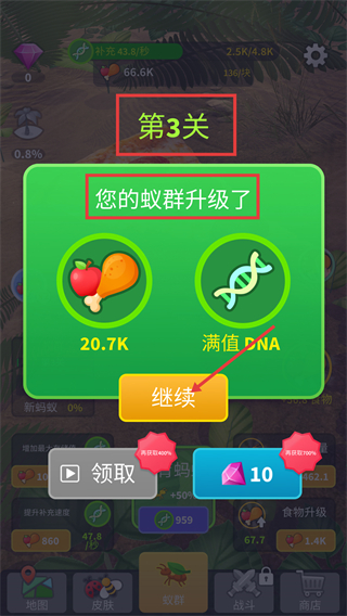 4、达成【第3关】后蚁群升级,可获得【20.7K-食物】与【满值-DNA】,点击【继续】按钮,即可推进后续游戏进程。