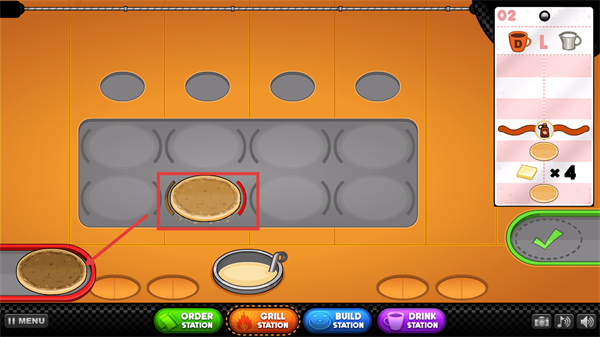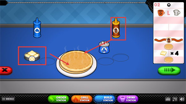 4、在组装环节,先添加黄油块,再用对应酱料瓶为煎饼加酱,按右侧需求完成配料后推进餐食制作流程。