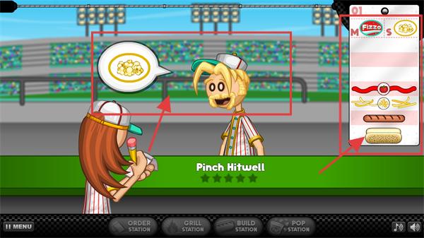 1、查看顾客【Pinch-Hitwell】的需求标识,对应右侧订单里的【热狗】样式,确认需制作含指定配料的餐食,同步关注顾客的反馈提示。