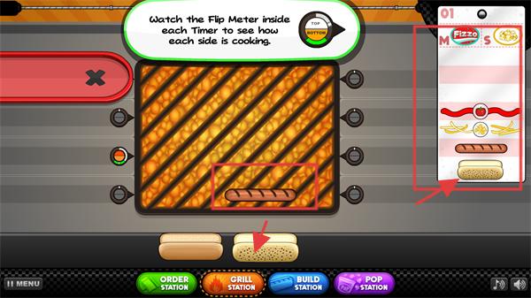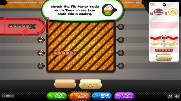 3、在烤架环节,参照【Flip-Meter】指引,移动烤架上的香肠调整位置,确保两侧烹饪程度匹配订单要求的标准。