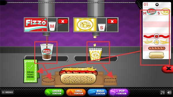 4、在配餐环节,按提示获取【Fizzo】饮品与【爆米花】,将其与制作好的热狗搭配,完成订单的配套餐食准备流程。