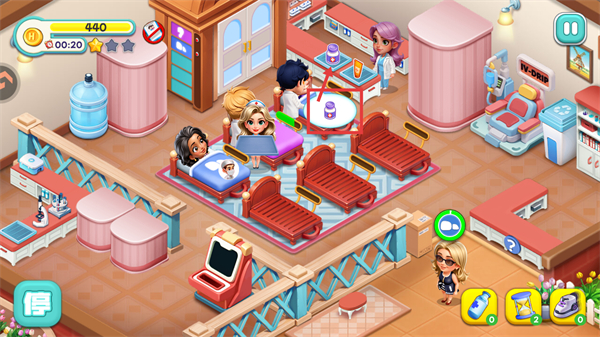 1、画面风格清新休闲且可爱,适配各类玩家群体,无需复杂操作,能让人们在经营医院的过程中享受轻松愉快的时光。
