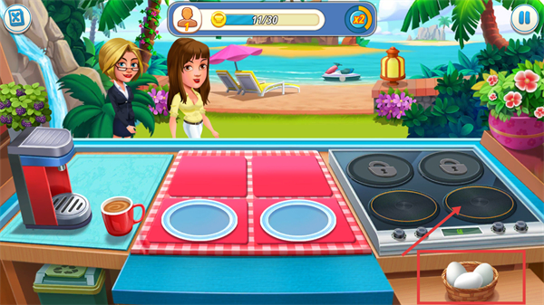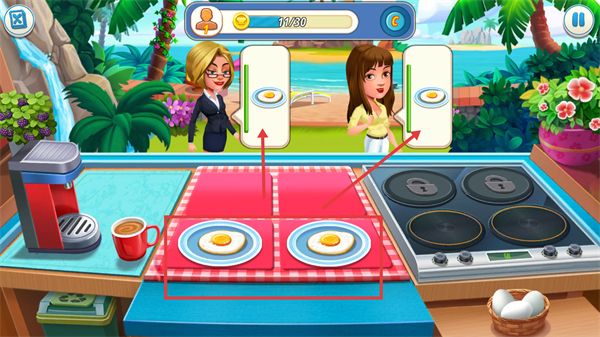 3、将制作好的【鸡蛋】菜品放置到对应盘子,满足顾客的菜品需求,完成订单提升金币进度,推进关卡进程。