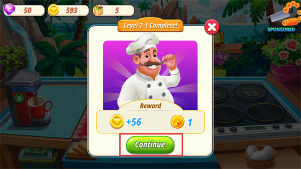 4、关卡完成后显示【Complete!】,获得相应的奖励,点击【Continue】按钮进入后续环节。