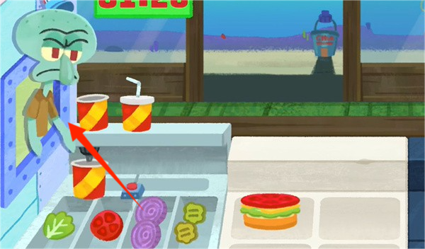 2、点击章鱼哥,将食材依次放置制作汉堡