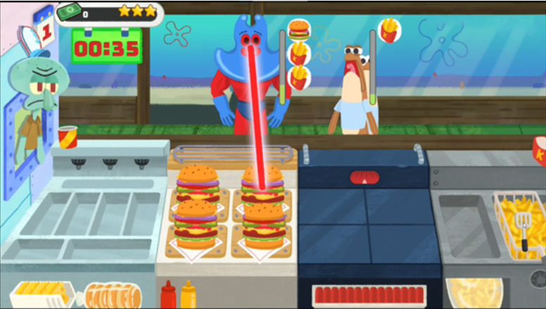 3、与章鱼哥共同经营:玩家将和章鱼哥一起经营蟹堡王餐厅,为不同顾客制作不同口味的汉堡,获取丰厚收益。