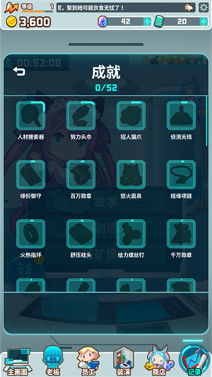 所谓员工便是公司最大的资产,游戏中除了型男美女,还有宅男御姐,拟人化动物甚至三国名将都能改为己用替您赚钱!50多名角色各有特长和技能,快来打造您的梦幻团队吧.