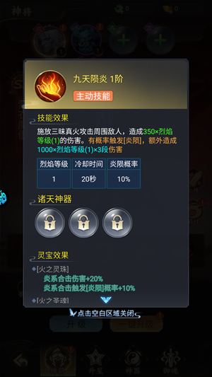 3、火之灵珠:腾火剧焰,红云蒸天,诀破祝型荡人间。炎系合击伤害+20%炎系合击触发[炎陨]概率+10%。