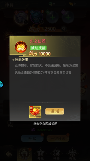 5、火之仙莲:业障如草,智慧似火,不受诸因缘,是名为涅架,炎系合击额外附加20%神将攻击的真实伤害。