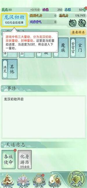 4、游戏中有三大量劫,分为龙汉初劫巫妖量劫、封神量劫。这里是当前量劫进度,当进度为0时,将会进入下一量劫。