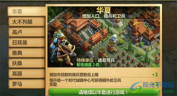 1、华夏第一印象就是人多,所以工人和卫兵的增长也最快,特色兵种为诸葛连弩,各项均衡可攻可防。