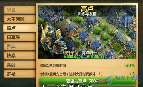 3、高卢缩短军队训练时间,增加联盟兵力上限,联盟捐兵利器长时间在线玩家的福利。