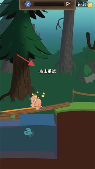 4、若角色失衡掉落水中,点击【点击-重试】重新开启当前赛道挑战,调整操作节奏再次尝试跨越水域。