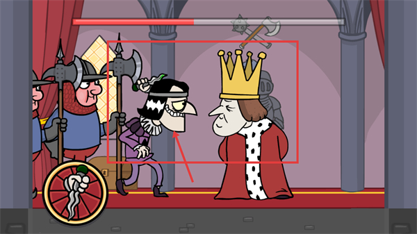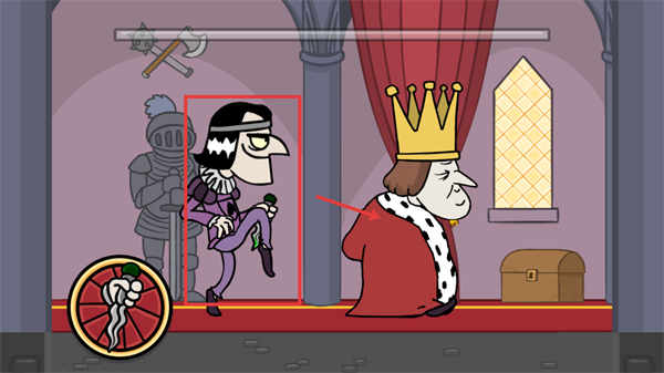 2、红色框选的紫色角色与国王区域,紫色角色要小心国王发现小刀。