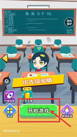 1、看到【画画尖子班】界面,点击红色框选的【开始游戏】按钮,进入绘画关卡,开启按轮廓临摹的画画挑战。