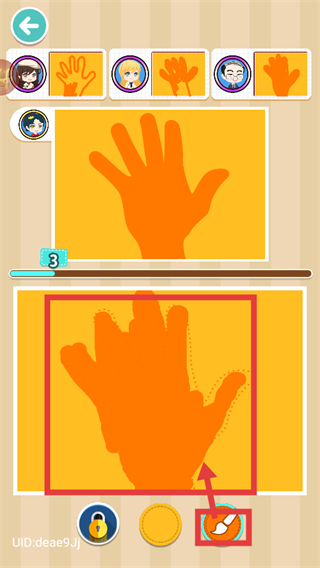 2、进入绘画关卡后,用红色框选的工具,对照上方手掌轮廓临摹下方区域,完成对应绘画内容,推进关卡进度。