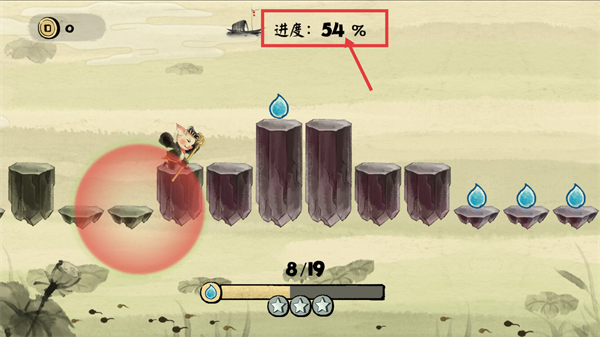 3、随着水滴收集数量增加,关卡进度会同步提升(如【进度-54%】),需持续收集剩余水滴。