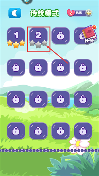 1、看到【传统模式】下的关卡列表,点击红色框选的【2】进入关卡,通关技巧是先完成低难度关卡积累消除经验,为后续关卡做准备。