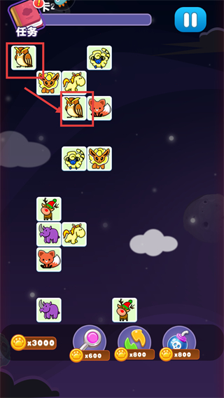2、进入消除界面后,找到红色框选的相同图案,通关技巧是优先连接相邻数量多的同图案,提升单次消除的得分效率。