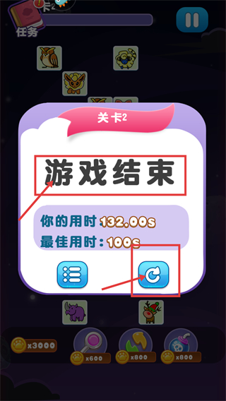 4、出现【游戏结束】提示后,点击红色框选的重置按钮重战,通关技巧是总结上轮用时问题,加快节奏突破【最佳用时-100s】。