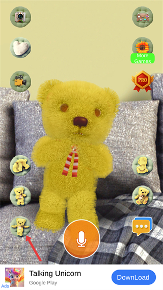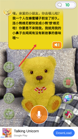 会说话的毛绒熊是一款主打3D治愈与语音互动的陪伴类娱乐产品,使用者可以与屏幕中逼真可爱的毛绒熊进行实时语音对话,小熊会以独特有趣的声音重复或回应你所说的话,还能讲述儿歌、故事与小知识。高品质的卡通画面与细腻的毛发渲染,带来强烈的视觉亲和力与沉浸感。通过简单的触摸操作,你可以戳动小熊的头部、手臂或脚丫,观看它做出练习、摆动耳朵等多种生动的动画反应,还能为它拍照记录温馨瞬间。内置的迷你游戏不仅能带来欢乐时光,还可赚取虚拟金币用于解锁更多互动内容。